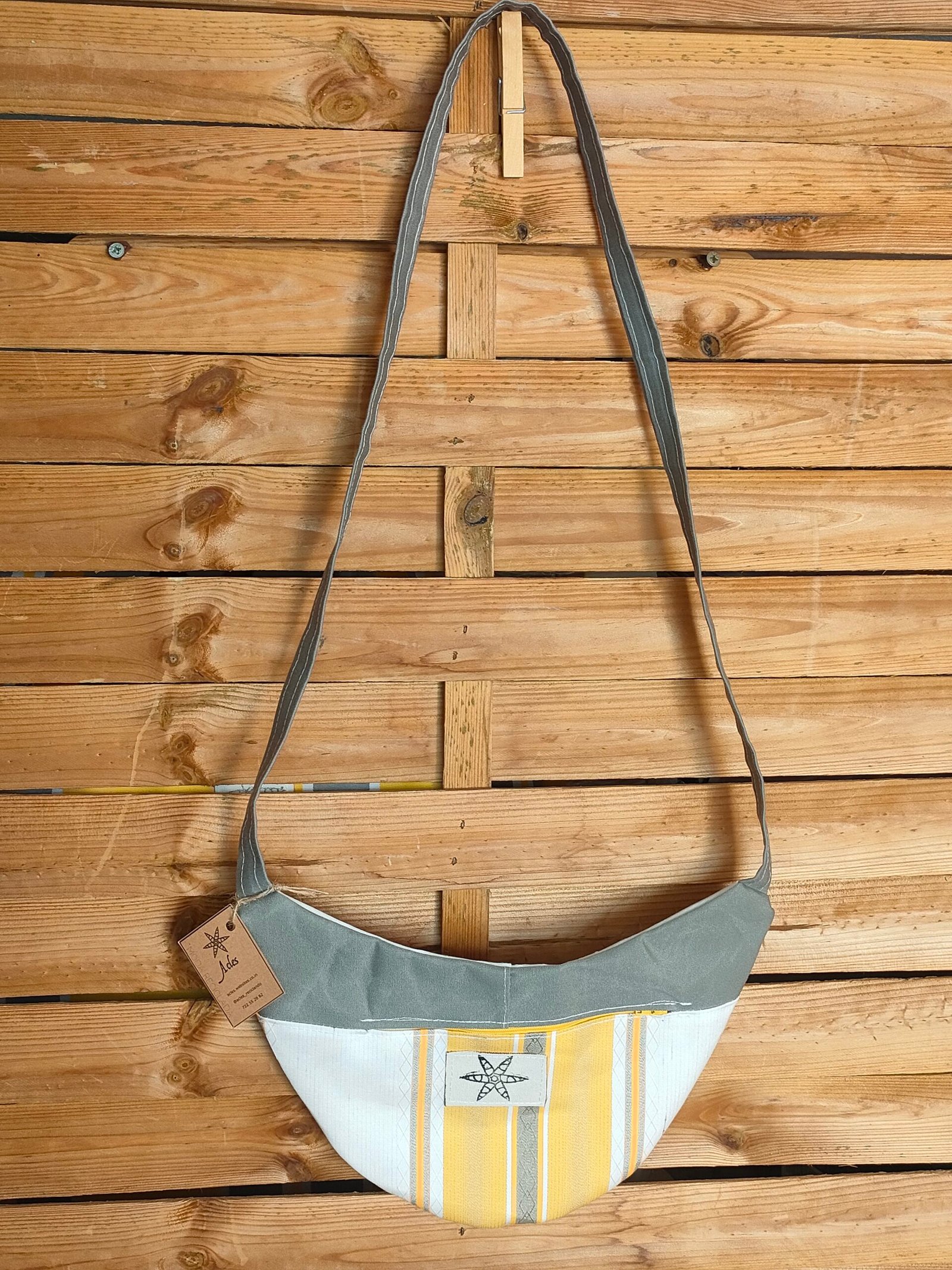 Bolso bandolero en dos tonos: Amarillo Línea y Gris. Correa larga para llevar cruzado y cierre por cremallera, confeccionado en lona 100% reciclada. Ligero, resistente y funcional para uso diario.