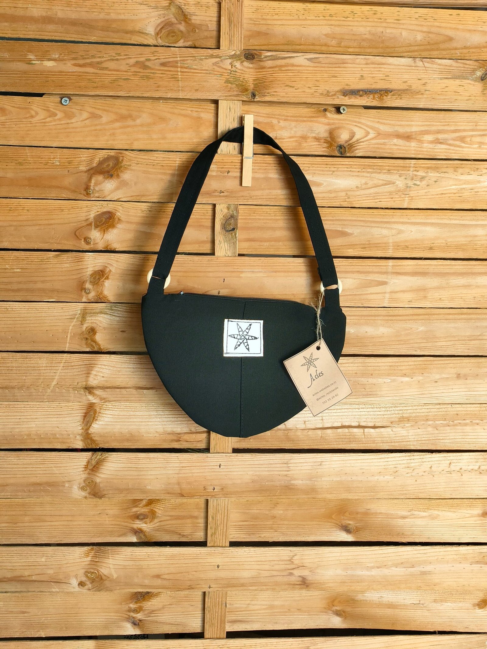 Bolso baguette de color negro, confeccionado en lona 100% reciclada y con cierre de cremallera. Ligero, resistente y diseñado para acompañarte en cada momento del día.