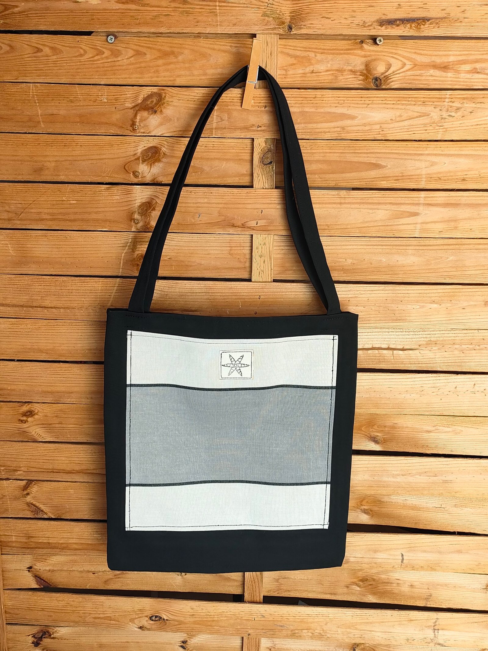 Bolso tote bag negro con bolsillo frontal de líneas en gris, negro y blanco roto, confeccionado en lona 100% reciclada. Ligero, resistente y diseñado para acompañarte en cada momento del día.