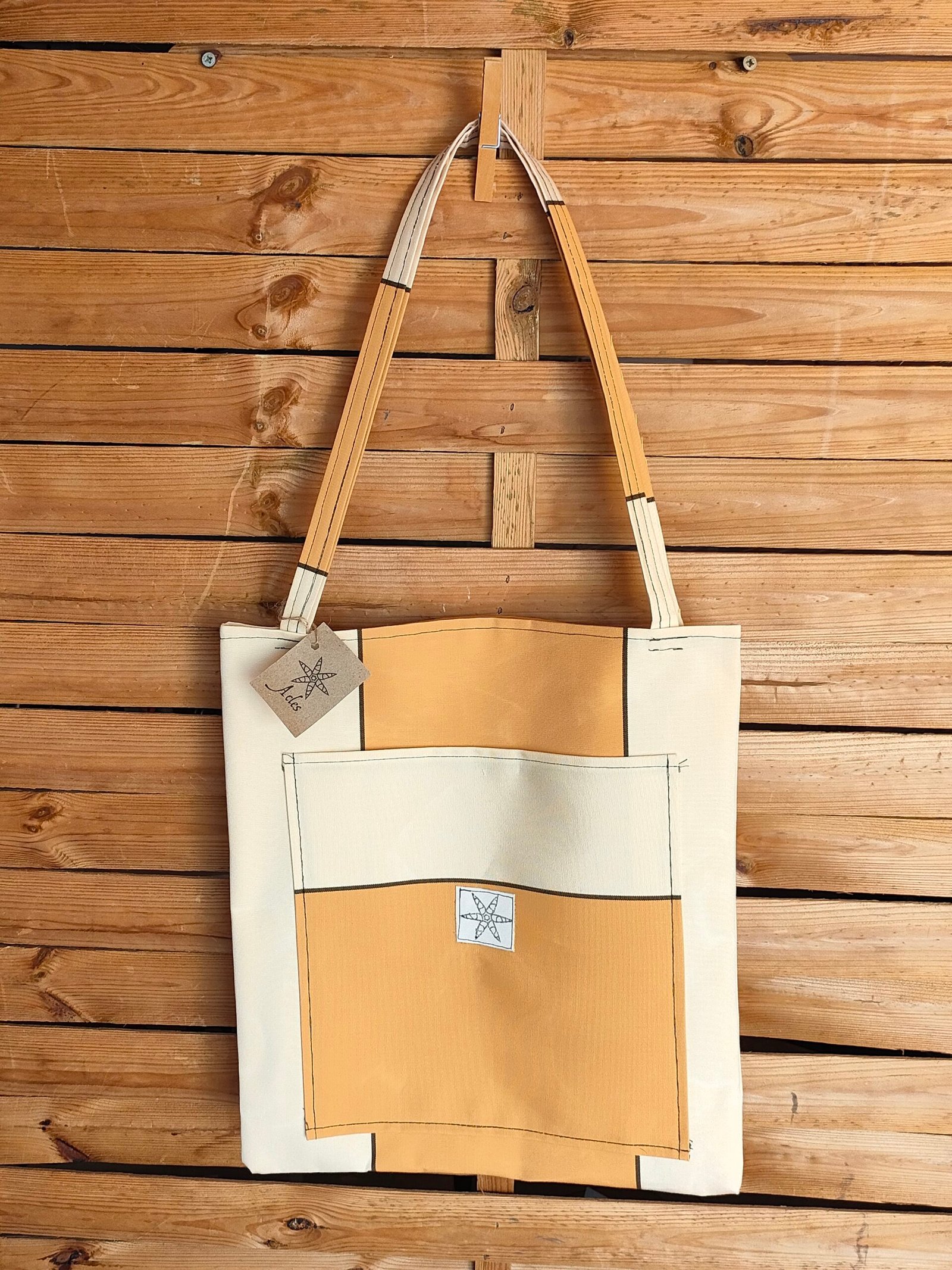 Medidas: Fondo de 37×41 cm, bolsillo de 31x3cm y doble asa de 75 cm.