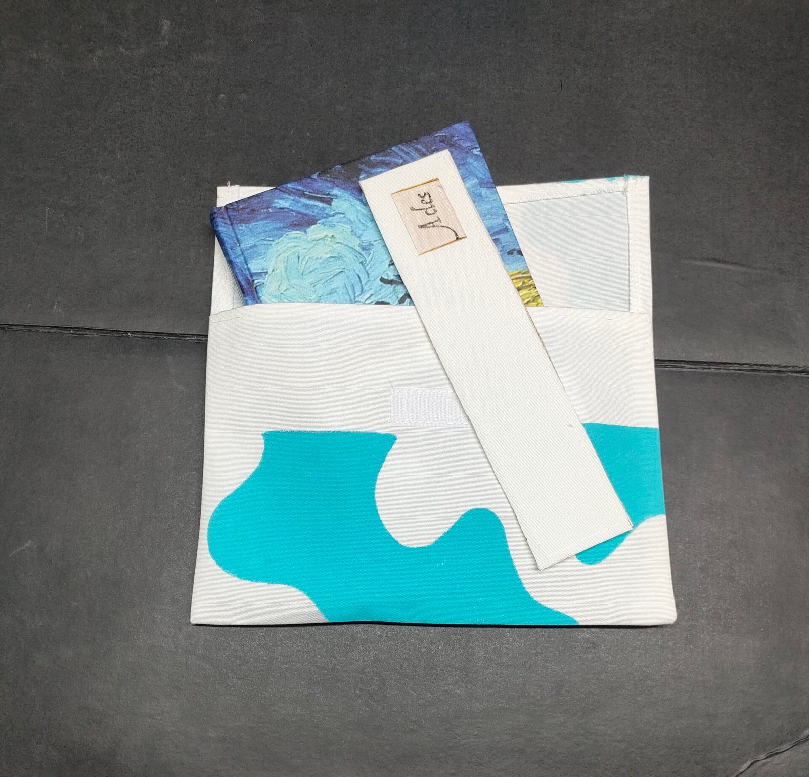 Funda de lectura dibujo mancha de pintura azul. Confeccionada de forma artesanal con lona 100% reciclada y cierre con velcro.