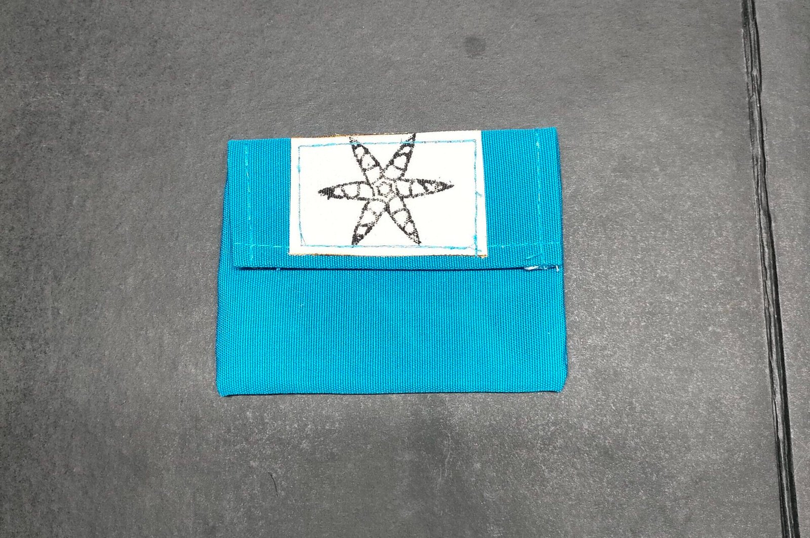 Monedero Azul claro, tamaño tarjetero para mayor versatilidad. Confeccionado de forma artesanal con lona 100% reciclada y cierre con velcro.