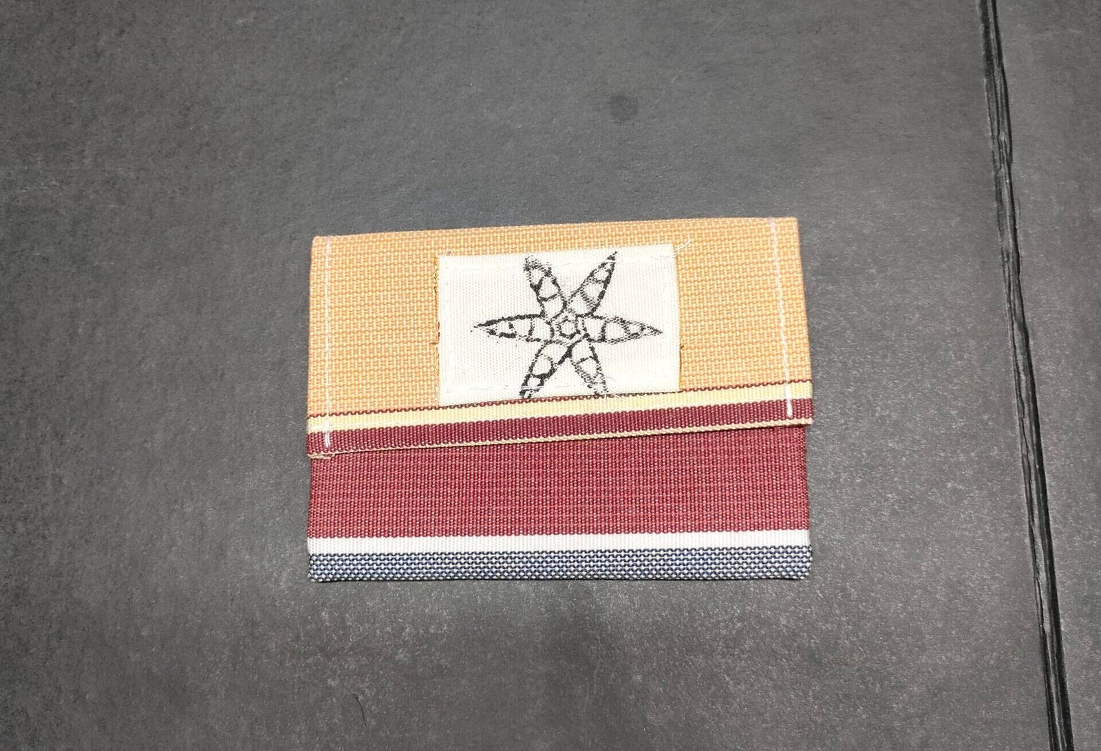 Monedero de líneas granate y rallado en naranja, tamaño tarjetero para mayor versatilidad. Confeccionado de forma artesanal con lona 100% reciclada y cierre con velcro.