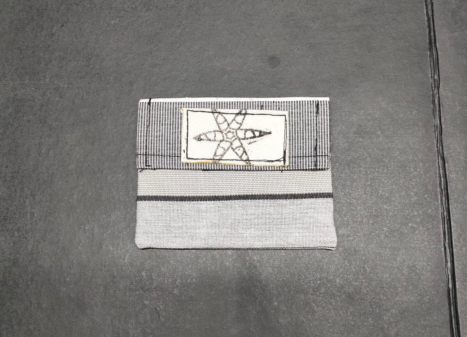 Monedero Gris de líneas en diferentes tonalidades, tamaño tarjetero para mayor versatilidad. Confeccionado de forma artesanal con lona 100% reciclada y cierre con velcro.