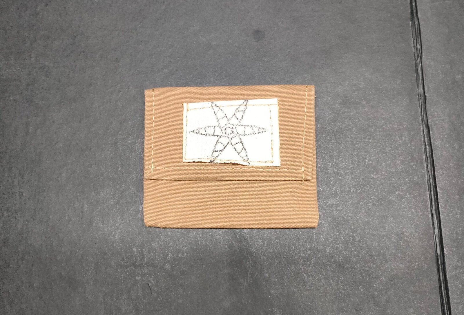 Monedero color Marrón claro, tamaño tarjetero para mayor versatilidad. Confeccionado de forma artesanal con lona 100% reciclada y cierre con velcro.