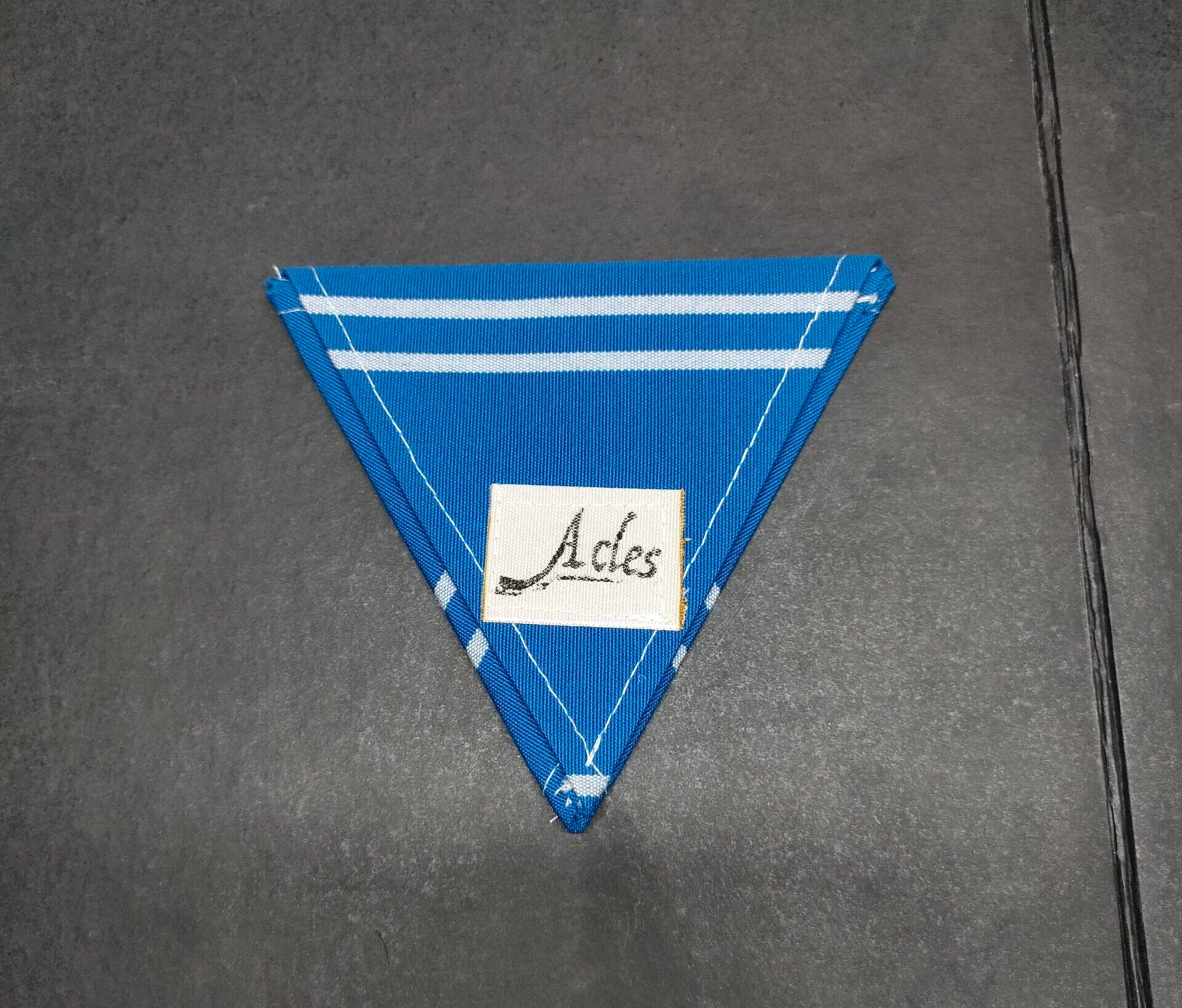 Monedero triangular Azul líneas blancas, con doble compartimento. Confeccionado de forma artesanal con lona 100% reciclada y cierre con velcro.